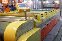 印花時(shí)網(wǎng)筒內(nèi)漿料高低位適中,細(xì)莖、小面積花存漿少一點(diǎn),大塊面花存漿多一點(diǎn)。雕印花樣每二到三小時(shí)蒸樣一次,檢查印花質(zhì)量。也可以在一定量的坯布中間接一塊白布,用以定時(shí)檢查雕印的印制質(zhì)量和園網(wǎng)質(zhì)量。根據(jù)面料需要的下漿量來(lái)控制、選擇壓力和磁棒(刮刀),細(xì)莖、小面積花型選擇磁棒10號(hào)或12號(hào),刮刀45-50cm;塊面花型選擇磁棒15-20號(hào),刮刀50cm;大塊面印花選擇磁棒25號(hào),刮刀55cm。壓力的大小隨著花型由細(xì)莖到塊面,則壓力由小到大配置?傊鶕(jù)園網(wǎng)印花機(jī)的性能調(diào)節(jié)好下漿量和滲透效果。