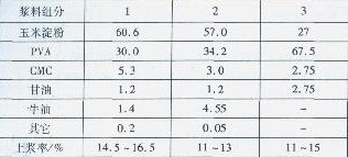 目前紡織廠已很少使用100%PVA上漿,大多以與淀粉為主,以及與其它漿料混合使用。表1為常用的混合漿料的組成。