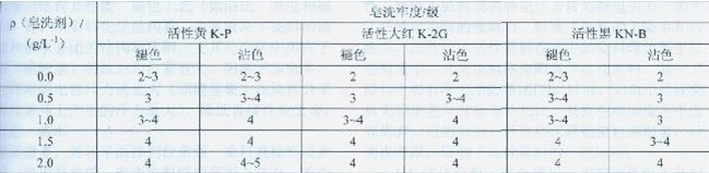 軋染織物經汽蒸固色后,織物上的水解染料和少量尚未參加反應的染料以及染液和固色液中的其他添加物必須充分洗凈,才能獲得優(yōu)良的染色牢度.從表1可以看出,隨著皂洗劑質量濃度的增加,織物的皂洗牢度不斷提高,在達到最佳用量后,皂洗牢度不再提高.原因是皂洗劑馬來酸.丙烯酸共聚物類有機高分子物有良好的膠體特性和分散作用,能和染料形成絡合物,防止洗下的染料重新染到布上。因此,選擇皂洗劑質量濃度為1.0~1.5g/L。