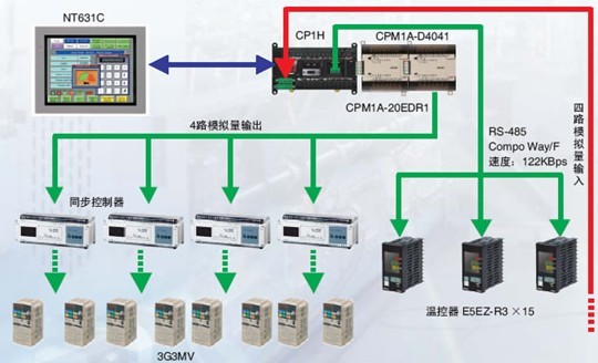 在蒸化機控制系統(tǒng)中,我們采用了歐姆龍高性能小型PLC CP1H,通過4路模擬量輸出模塊連接同步控制器來控制歐姆龍3G3MV系列變頻器。蒸化機烘房溫度控制采用了歐姆龍公司的溫控器E5EZ,通過Compo Way/F通信協(xié)議(速度112kbps)直接和CP1H的RS-485口通訊,PLC可以直接改變E5EZ的控制參數(shù)并實時監(jiān)控。人機界面使用歐姆龍公司10.4” 彩色觸摸屏NT631C,進行參數(shù)和工作流程的監(jiān)控。