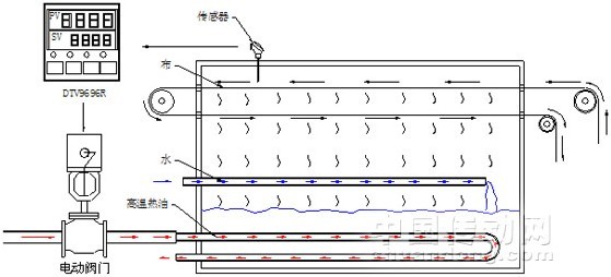 蒸花機(jī)電氣控制主要有兩部分控制組成:第一部分是將染布從設(shè)備外引入設(shè)備的運(yùn)動控制部分,主要有臺達(dá)EH 系列PLC和臺達(dá)變頻器以及臺達(dá)DOP人機(jī)組成。第二部分則由臺達(dá)DTV閥位控制,溫度傳感器和電動閥門構(gòu)成的溫度控制系統(tǒng)。本文暫時針對對第二部分(圖3)展開介紹與探討。
