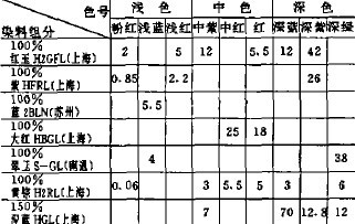 我廠一般選用深藍HGL、大紅HBGL,黃棕H2RL,紅玉H2GFL、翠藍S-GL、紫HFRL等分散染料進行拼色印花,其次是選用對棉沾污基本能去除的染料,如大紅、黃、黃棕、紅玉、紫、孔雀藍等鮮艷色,但是分散藍或分散藍與其他染料拼色組成的色漿,經(jīng)印制焙烘、還原清洗時沾污比較嚴重,經(jīng)兩次還原清洗后效果并不明顯,只有通過H2O2輕漂才能去凈。其中福隆藍S-BGL對棉沾污嚴重,多次還原清洗也無法去盡,但織物色光越洗越萎暗,必須堵絕使用;分散草綠SE-GFL不但其升華牢度差,對棉沾污更嚴重,也應盡量避免使用。一般用在印花上的分散染料多數(shù)考慮把明亮的品種用于淺淡色澤,給色量高的用于深濃色澤。