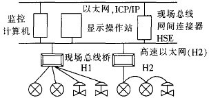 現(xiàn)場總線把通信一直延伸到生產(chǎn)現(xiàn)場或生產(chǎn)設(shè)備.用于過程自動化和制造自動化的現(xiàn)場設(shè)備或現(xiàn)場儀表互聯(lián)的現(xiàn)場通信網(wǎng)絡(luò),如圖2所示。該圖代表了FF現(xiàn)場總線控制系統(tǒng)的網(wǎng)絡(luò)結(jié)構(gòu)。