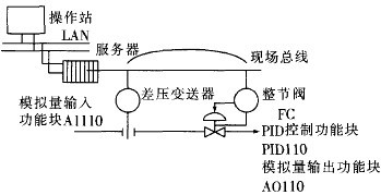 FCS廢棄了DES的輸入/輸出單元和控制站.把DCS控制站的功能塊分散地分配給現(xiàn)場儀表.從而構(gòu)成虛擬控制站 由于功能分散在多臺現(xiàn)場儀表中.并可統(tǒng)一組態(tài).所以可供用戶靈活選用各種功能塊,對所需控制系統(tǒng)實(shí)現(xiàn)徹底的分散控制.如圖3所示 其中差壓變送器含有模擬量輸入功能塊(AI110),調(diào)節(jié)閥含有PID控制功能塊(PID110)及模擬量輸出功能塊(AO110)。這三個(gè)功能塊構(gòu)成流量控制回路。