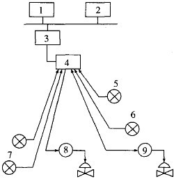 1-操作器接151:2-過程計(jì)算機(jī);3-多回路控制器;4-模擬I/O接1:7:5-全部4~20 mA模擬信號;6,7-模擬變送器;8,9-模擬I/P