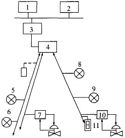 1-操作器接口:2-過程計(jì)算機(jī):3-多回路控制器;4-數(shù)字I/O接口;5-手操通信器;6,9-智能變送器7,10-智能定位器;8-全多站;雙向數(shù)字通信器;11-現(xiàn)場指示器