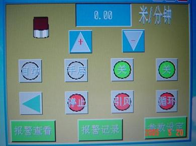 系統(tǒng)的開(kāi)啟及引風(fēng)機(jī)、循環(huán)風(fēng)機(jī)的啟停由觸摸屏來(lái)進(jìn)行控制,同樣進(jìn)布/出布的加減速度的快慢,糾偏時(shí)間間隔由觸摸屏來(lái)進(jìn)行設(shè)定;同時(shí)設(shè)有報(bào)警記錄,以便隨時(shí)查詢(xún)。如下圖: