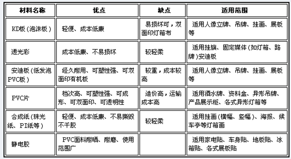 2、常用制作材料:環(huán)保合成紙, PVC片材,PVC不干膠貼,燈箱布,KD板(泡沫板),低發(fā)泡PVC板,有機片,PP板,ABS板,布幅等;特殊材料有:鋅鐵皮,不銹鋼,玻璃等。