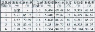 乳液聚合條件,如乳化劑、引發(fā)劑和溫度對(duì)聚合穩(wěn)定性起著重要作用。表1列示三者對(duì)乳液凝膠率和單體轉(zhuǎn)化率的影響。
