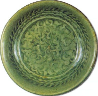 在為北宋宮廷燒制御用汝瓷之前,河南臨汝(今汝州市)及寶豐一帶的窯場(chǎng)已經(jīng)大規(guī)模地生產(chǎn)服務(wù)于民間大眾的日用瓷器。這類民用瓷以青釉食具為代表作品。此件瓷盤敞口、弧壁、圈足、平底,盤心模印出折枝花卉,周圍環(huán)繞著水波紋,內(nèi)外滿施豆青色釉,但底足處露出稍泛黃色的胎體,足部也粘有砂粒而略顯粗糙,但具有濃郁的生活氣息,是民間汝瓷的典型器皿。