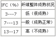 為了保證織物染色一致均勻,棉紡織廠不僅要在不同品種的棉花中測試和控制棉纖維的平均成熟度,而且還要測試和控制未成熟纖維的比例,而不能僅依據(jù)馬克隆值來進(jìn)行原棉的配棉。只有同一品種的原棉,纖維細(xì)度與成熟度才有較高的相關(guān)性。但對(duì)于使用原棉品種不同、產(chǎn)地差異大的棉紡織廠來說,僅依據(jù)各配棉成分的馬克隆值相近來控制各配棉成分成熟度差異是不夠準(zhǔn)確的。棉纖維的成熟度與生長條件、棉花品種有關(guān),特別是受生長條件影響較大。不同品種的棉花在正常吐絮后采摘的同一批次中包含成熟和不成熟的纖維。未成熟纖維含量(IFC)是指胞壁充實(shí)度小于0.25的這部分纖維所占比例。IFC值越小,表明纖維整體成熟度越好,離散越小,染色的一致性越好,IFC所對(duì)應(yīng)的纖維整體成熟狀況見下表1:
