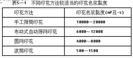 印花效果與色漿的黏度關(guān)系密切,色漿的黏度大小取決于糊料的黏度以及加入的化學(xué)藥劑、染料等的影響。要獲得良好的印制效果,色漿必須有適當(dāng)?shù)、較為穩(wěn)定的黏度。一般來說,精細線條、雪花點子、貓爪,干筆需要黏度高的色漿。大塊面或滿地花型、云紋等,色漿黏度不宜高。印花方法、印花方式的不同,所要求的色漿黏度也不同,大致范圍見表5—1。