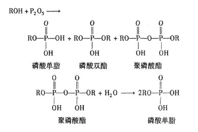 在裝有攪拌器和溫度的三口燒瓶中,加入一定量的異辛醇聚氧乙烯醚,在快速攪拌下分次加入五氧化二磷(溫度控制在50℃以下),加完后升溫至65~70℃,反應(yīng)2~3h后加入少量的水,水解30min,取樣測定產(chǎn)物中單雙酯與游離磷酸含量。降溫至50℃以下,用20%氫氧化鈉溶液緩慢中和至pH值=7~8,調(diào)節(jié)固含量在50%左右,出料即得外觀為無色透明液體。主要反應(yīng)如下: