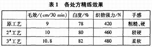 按以上各處方配制練漂液,于95℃練漂60 min,浴比1:10。不同處方的精練效果見表1。