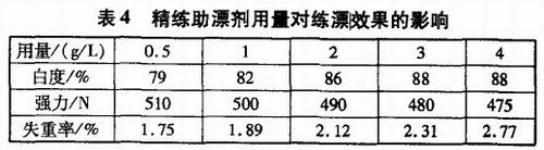 在溫度為95℃下處理40 min,精練助漂劑ON用量對(duì)練漂效果的影響見(jiàn)表4。