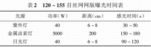 曬版曝光時間受感光機種類、光源、功率、距離、軟片的透明度、絲網(wǎng)目數(shù)、感光膠粘度、光敏劑用量、涂膜厚度、花紋圖案等多種因素影響,一般需要試用或用密度梯尺曝光對照檢測是否達(dá)到使膠膜硬化的曝光時間后,再確定正確的曝光時間。根據(jù)實際感光制版操作中所積累的數(shù)據(jù),120-155目的絲網(wǎng)網(wǎng)版的參考曝光時間見表2。