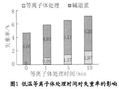 為了比較、分析等離子體對(duì)漿料的作用情況,將常規(guī)堿退漿和經(jīng)氬氣低溫等離子體處理不同時(shí)間的失重率列于圖1中。結(jié)合文獻(xiàn)[7]研究成果,確定等離子體處理?xiàng)l件為100 W,30 Pa。