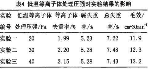 為最終確定純亞麻織物的最佳低溫等離子體處理?xiàng)l件,繼續(xù)研究了壓強(qiáng)對(duì)實(shí)驗(yàn)結(jié)果的影響。實(shí)驗(yàn)結(jié)果如表4所示。