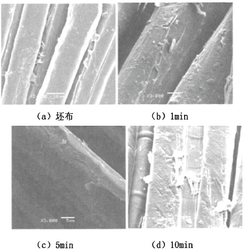 為了探討低溫等離子體對(duì)漿料的氧化、降解和刻蝕作用,拍攝了掃描電鏡照片(SEM),以觀察亞麻纖維表面性狀的變化,見(jiàn)圖2。
