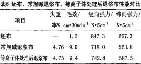 如表5所示,當(dāng)退漿時(shí)間為10 min,NaOH濃度為6g/L時(shí),失重率為4.75%,毛效為9.4 cm·30 min-1,達(dá)到常規(guī)堿退漿30 min,NaoH濃度為10 g/L的效果。為對(duì)比坯布、常規(guī)堿退漿布以及經(jīng)低溫等離子體處理后的退漿布的性能,將各項(xiàng)指標(biāo)列于表6中。