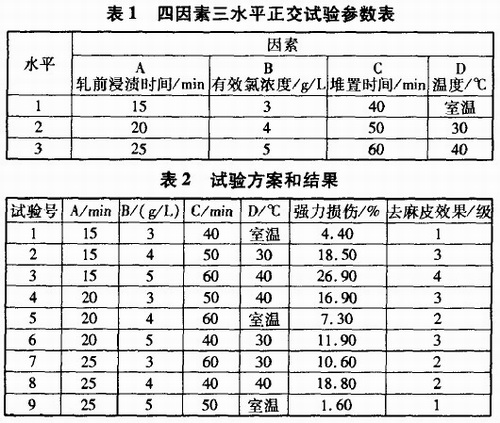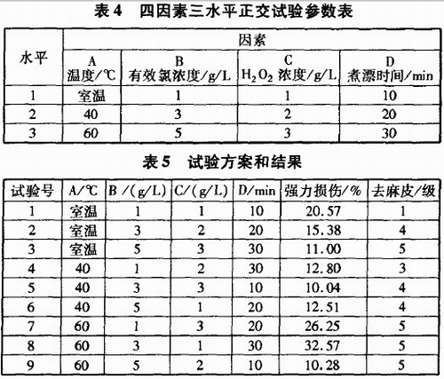 經(jīng)過(guò)煮練的織物,大部分漿料及雜質(zhì)已去除,如果麻品質(zhì)較差,還需進(jìn)行氯一氧連漂以去除麻皮,其中次氯酸鈉漂白液的pH值、有效氯濃度、溫度和時(shí)間是影響漂白工藝的重要因素。利用正交試驗(yàn)表L9(3的4次方 )設(shè)計(jì)四因素三水平試驗(yàn) ,優(yōu)選最佳的NaCIO軋漂工藝條件,見(jiàn)表1~3。