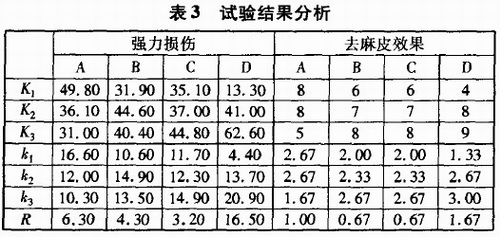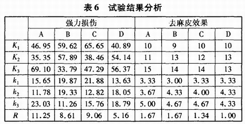 對(duì)于強(qiáng)力損傷,從直觀分析的角度出發(fā),由極差大小得出影響因子的主次順序?yàn)镈>A>B>C;對(duì)于去麻皮情況,從直觀分析的角度出發(fā),由極差大小得出影響因子的主次順序?yàn)镈>A>B=C,即影響強(qiáng)力和去麻皮效果最大的因子是處理溫度,其次是預(yù)浸時(shí)間。取麻皮級(jí)數(shù)最高的水平,確定較優(yōu)的NaCIO軋漂工藝條件為A1B3C3D3,即軋前浸漬15 min,有效氯濃度為5 g/L、堆置60 min、堆置溫度4o℃。此時(shí)強(qiáng)力損傷為26.90%。