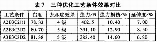 由表7可看出,三種優(yōu)化工藝條件對(duì)織物的白度、去麻皮效果都很好,且強(qiáng)力損傷都較小。若去麻皮要求達(dá)5級(jí),強(qiáng)力損傷稍低,可選擇A2B3C3D2工藝;若麻皮要求基本去除,強(qiáng)力要求高,可選擇A2B3C2D1工藝。另外,比較表5與表7可知,表5中第3號(hào)試驗(yàn)的結(jié)果與表7中A2B3C3D2的結(jié)果相當(dāng),其去麻皮均達(dá)5級(jí),前者強(qiáng)力損傷為11.00% ,后者為12.90% 。故按工廠要求,選擇表5試驗(yàn)號(hào)3工藝或表7 A2B3C3D2為DCCA漂白的最佳工藝條件。