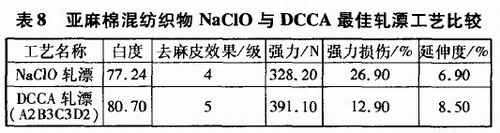 對(duì)于兩種氯漂白劑,從白度、去麻皮效果和強(qiáng)力損傷等方面比較,兩者軋漂工藝對(duì)漂白效果的影響,結(jié)果如表8所示。
