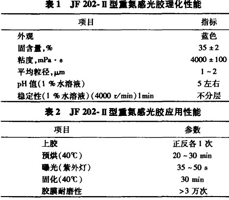 JF 202A及其改進(jìn)型的JF 202一II型平網(wǎng)感光膠,其外觀呈藍(lán)色水性乳膠,膠體細(xì)膩潤滑,既能耐酸堿又能耐還原劑,適用于防拔染印花工藝和活性染料印花工藝,100~300目的絲網(wǎng)均能適用。其顯著特點(diǎn)是顯影較快、沖洗牢度好、耐印率高和適用性強(qiáng),可用于平網(wǎng)印花機(jī)的磁棒、刮刀印花和手工臺(tái)板印花。