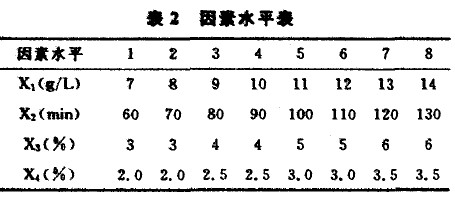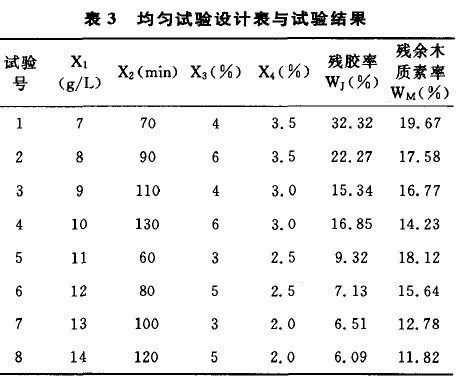選取U8 *(8的5次方 )均勻設(shè)計(jì)表,根據(jù)其使用表的規(guī)定,選擇其中的l,2,3,5列,組成U8*(8的4次方)表。具體試驗(yàn)安捧及試驗(yàn)結(jié)果見表3