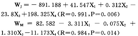 從表3中直接看到的最好條件是第8號試驗(yàn),殘膠率Wj 6.09%、殘余木質(zhì)素率Wm 11.82 9/5。由于均勻設(shè)計(jì)不具備整齊可比性,并且每個因素的極差都相等,因此不適合做直觀分析。對均勻設(shè)計(jì)結(jié)果的深入分析方法是采用回歸分析。利用SPSS軟件,建立殘膠率wJ、殘余木質(zhì)素率Wm 同四因素的有效多元線性回歸方程。