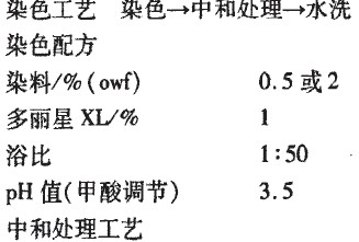 (2)多麗星XL系列酸性染料色澤鮮艷,色彩飽和度高,能滿足潘通色卡中各種不同鮮艷色的要求。在pH值3.5條件下染色,染料間的配伍性能優(yōu)良。