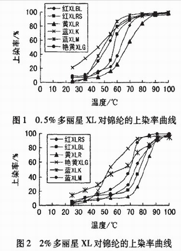 0.5%和2%(owf)多麗星XL系列染料于不同溫度下在普通錦綸織物的上染率曲線見圖1和圖2。
