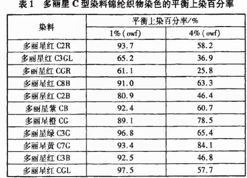 表l為多麗星c型系列染料染錦綸織物時的平衡上染百分率。由表1可知,多麗星C系列染料的平衡上染百分率因染料品鐘而異。紅C2R、紅C8B、紫CB、綠C3G和紅CGL等染料在l%(owf)染色濃度時,平衡上染百分率在90%以上;而染色濃度為4%(owf) 時,僅多麗星橙CG幫黃C7G豹上染吾分率達(dá)約%竣上,其它染料均較低。這是因?yàn)殄\綸纖維的染座數(shù)量不變,達(dá)到飽和值,再增加染料濃度,平衡吸附百分率反而下降。
