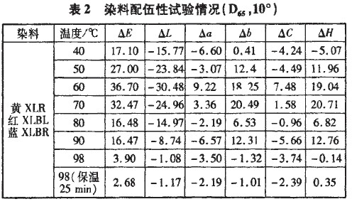 實(shí)際生產(chǎn)中,通常要用兩種或兩種以上的染料進(jìn)行拱色,這就需要考慮染料的配伍性題。以多麗星黃XLR、紅XLBL和藍(lán)XLBR為例,進(jìn)行三原色拼色試驗(yàn),染色總濃度2.1%(owf)。以一組染色pH值為3.0的同濕染色樣作標(biāo)樣,另一組染色pH 值3.5的染色樣為試樣,分析pH值、溫度變化引起的色變情況,結(jié)果見表2。
