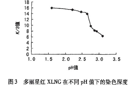 由圖3可知,隨著染浴pH值降低,多麗星大紅 XLNG染色深度增加,當(dāng)pH值從3.0降至2.6,染色深度急劇增加;繼續(xù)降低pH值至2以下,顏色深度無明顯提高。這是因?yàn)楫?dāng)pH值降至3以下,錦綸的末端氨基幾乎全部吸附染料,進(jìn)一步降低pH值,酰胺基開始吸附質(zhì)子,產(chǎn)生超當(dāng)量吸附,染料和纖維聞發(fā)生范德華力和氫健結(jié)合,終維的可及度增加,能吸附更多的染料,獲得最大給色量。因此,降低染色pH值,可以較好地提高高強(qiáng)度錦綸織物的染色深度。但錦綸染色的 pH值在3以下時,普通酸性染料染色易產(chǎn)生色花色差等疵病,上染過程難以控制。而多麗星大紅XLNG由于移染性和覆蓋性好,pH值較低時也不會因上染過快而引起染色不勻。