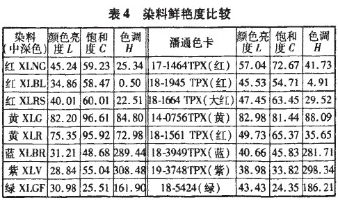 對于黃色染料XLG、XLR的染樣,其色彩飽和度C均超過色卡14-07567PX黃,且黃XLG染樣亮度L與色卡黃一致,色調(diào)H相近。染料藍(lán)XLBR、紫XLV程綠 XLGF與標(biāo)準(zhǔn)卡的相關(guān)色調(diào)也相近,但色澤更鮮艷飽滿。除了表中艇羅lj的XL型染料,其它XL系列染料多數(shù)具有優(yōu)異的染色鮮艷度。