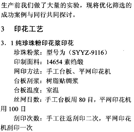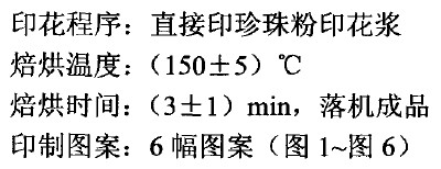 印花程序:先印酸性染料色漿套色,然后刮印珍珠粉印花漿 初始烘干:(120±5)℃