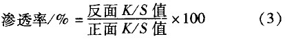 3)K/S值、滲透率和色澤不勻度用電子測色配色儀測定印花織物花紋處的K/S值;由正反面的K/S 值按式(3)計算滲透率: