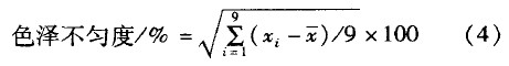 選擇九處印花花紋測定K/S值,并計算平均值,按式(4)計算色澤不勻度,該值越小,則印花均勻性越好。