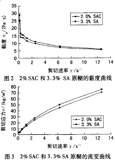 圖2、圖3分別為兩只原糊的黏度曲線和流變曲線。