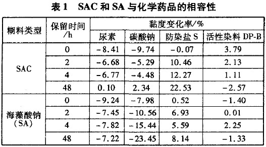 由表1可知,SAC原糊對各類化學(xué)藥品的穩(wěn)定性,總體好于海藻酸鈉原糊,而且放置時間越長,優(yōu)勢越明顯。由此可見,SAC對活性染料印花用的化學(xué)藥品有很好的適應(yīng)性,容易制得穩(wěn)定的印花色漿。