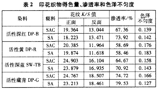 分別用活性深紅DP—B、活性黃DP—R、活性深藍 SW—TB和活性藏青DP—G在平紋棉織物上印花,測試印花織物正反面的K/S值、色澤不勻度及滲透率情況,見表2。
