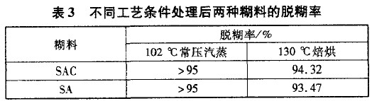表3中,102℃常壓汽蒸是活性染料印花最常用的固色條件,在此條件下,SAC糊和sA糊均可達到較理想的脫糊率(大于95%)。經(jīng)130℃ 焙烘處理后, SAC脫糊率仍達94.32%,略高于sA糊。