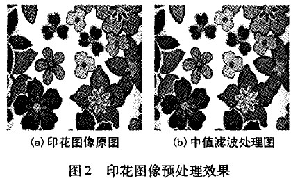 印花圖像在采集、處理等環(huán)節(jié)都可能會(huì)引人噪聲,因此噪聲抑制對(duì)圖像處理及后續(xù)自動(dòng)對(duì)花控制環(huán)節(jié)十分重要。噪聲主要來(lái)源于CCD(電荷耦合元件)的熱噪聲、電器機(jī)械運(yùn)動(dòng)產(chǎn)生的震動(dòng)噪聲等,它們對(duì)圖像信號(hào)幅度和相位的影響十分復(fù)雜。為了抑制噪聲,改善圖像質(zhì)量,本項(xiàng)目采用中值濾波法(Median Filter)。中值濾波法具有去噪能力強(qiáng)、圖像邊界細(xì)節(jié)保持好、處理速度快等優(yōu)點(diǎn)。它是一種非線性的空間濾波技術(shù),在一定程度上可以克服線性濾波帶來(lái)的圖像細(xì)節(jié)模糊化。印花過(guò)程中獲取的圖像具有很強(qiáng)的紋理特征,使用中值濾波可以有效地保留細(xì)節(jié),詳見(jiàn)圖2。