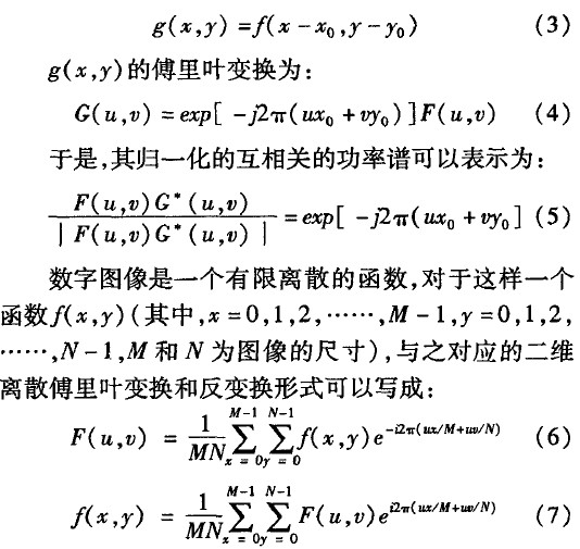 兩幅圖片的相位相關(guān)計(jì)算可以歸納為:首先對(duì)圖片分別計(jì)算它們的離散傅里葉變換(DFT)形式,然后計(jì)算歸一化相關(guān)功率譜,最后對(duì)其求離散反傅里葉變換(IDFT)。