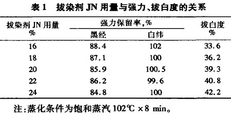 隨著黑色牛仔布色澤烏黑度提高,浮色越多,拔染越難;反之,則較易。雖然硫化黑染料具有可拔性,但拔白性較差,僅能達(dá)到中等拔白水平,拔白度為40%左右。隨著拔染劑JN用量增加,拔白度稍有提高。黑經(jīng)強(qiáng)力保留率達(dá)到80%以上(見(jiàn)表1)。