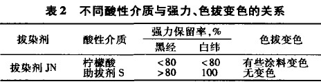 拔染劑JN用于靛藍(lán)牛仔布拔染印花,通常以檸檬酸作為酸性介質(zhì)。若用于黑色牛仔布拔染印花,則對(duì)黑經(jīng)白緯都會(huì)造成較大損傷,強(qiáng)力保留率均低于80%(見(jiàn)表2)。