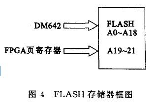 2.4.2 程序存儲器模塊(FLASH) 系統(tǒng)中可執(zhí)行程序代碼遠遠超過了lk bytes,故采用外擴的程序存儲器,使其能夠有足夠的空間保存可執(zhí)行程序代碼.該系統(tǒng)中擴展了一塊8M×8bit的FLASH 芯片AM29LV033C,用于存儲系統(tǒng)程序代碼,地址空間映射在 DM642的CE1空間的低位.我們采用分頁的方式來訪問存儲器,將FLASH的高三位作為頁選擇位,如圖4所示.這樣把FLASH共分為8頁,每頁為1M存儲空間,由DM642通過對邏輯器件FPGA 編程完成對每一頁存儲空間的選擇.