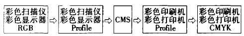 RGB顏色空間與CMYK顏色空間都是與設備相關的顏色空間,不能在不同的設備之間準確地傳遞顏色信息,即不同的設備具有不同的顏色空間。彩色顯示器和掃描儀采用的是 RGB顏色空間,而彩色印刷機和彩色打樣機采用CMYK顏色空間。為了實現(xiàn)不同的設備上的顏色匹配,數(shù)字噴墨印前系統(tǒng)采用色彩管理系統(tǒng)CMS(Color Management System),實現(xiàn)色彩管理三要素,即校準、特性化和轉(zhuǎn)換。其基本原理為: